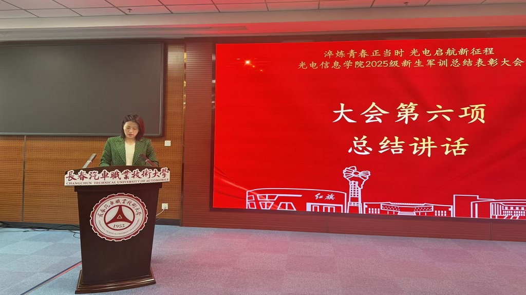 大会最后,学院党支部副书记马海艳作总结讲话。她首先向圆满完成军训任务的全体新生表示热烈祝贺,同时,她高度评价了此次军训取得的丰硕成果,并寄语全体2025级新生,希望同学们将军训中收获的宝贵财富转化为砥砺前行的不竭动力,坚定理想信念,练就过硬本领,秉承光电信息学院的优良传统,在未来的求学道路上不断创造新的辉煌,为实现个人理想和担当时代使命而努力奋斗。