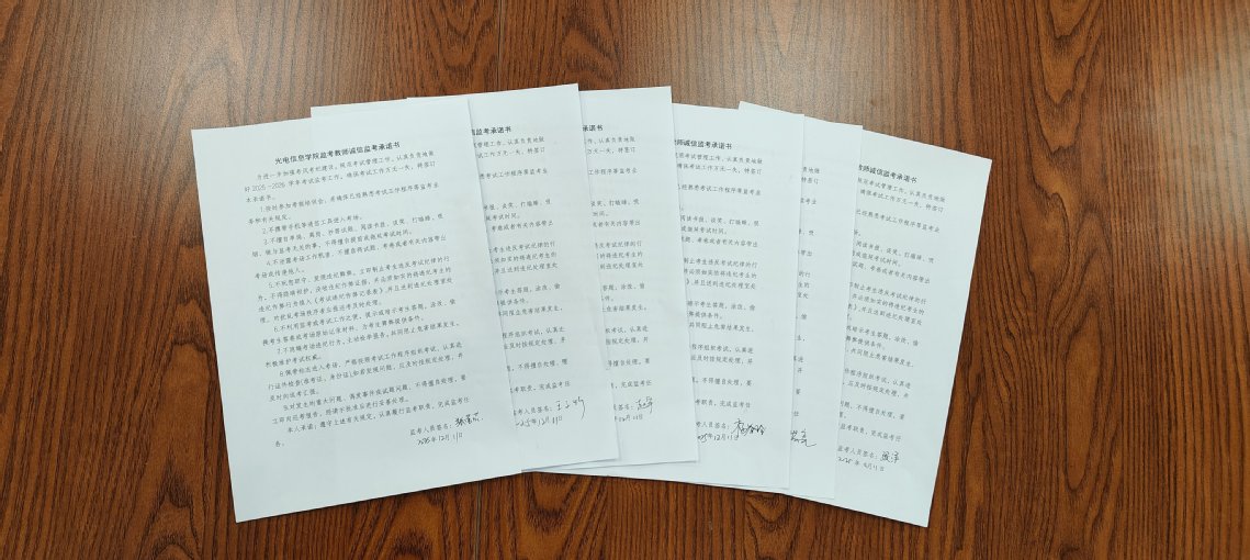 为扎实推进2025-2026学年第一学期教学管理与考务工作,锚定“廉洁从教、公正监考”核心目标,近日,光电信息学院召开“廉之恒道”主题教风·考风工作会。会议由教学院长张洋主持,全体任课教师参会,现场集中签署《光电信息学院监考教师诚信监考承诺书》,以制度约束与书面承诺双保障,夯实教学考试公平公正底色。